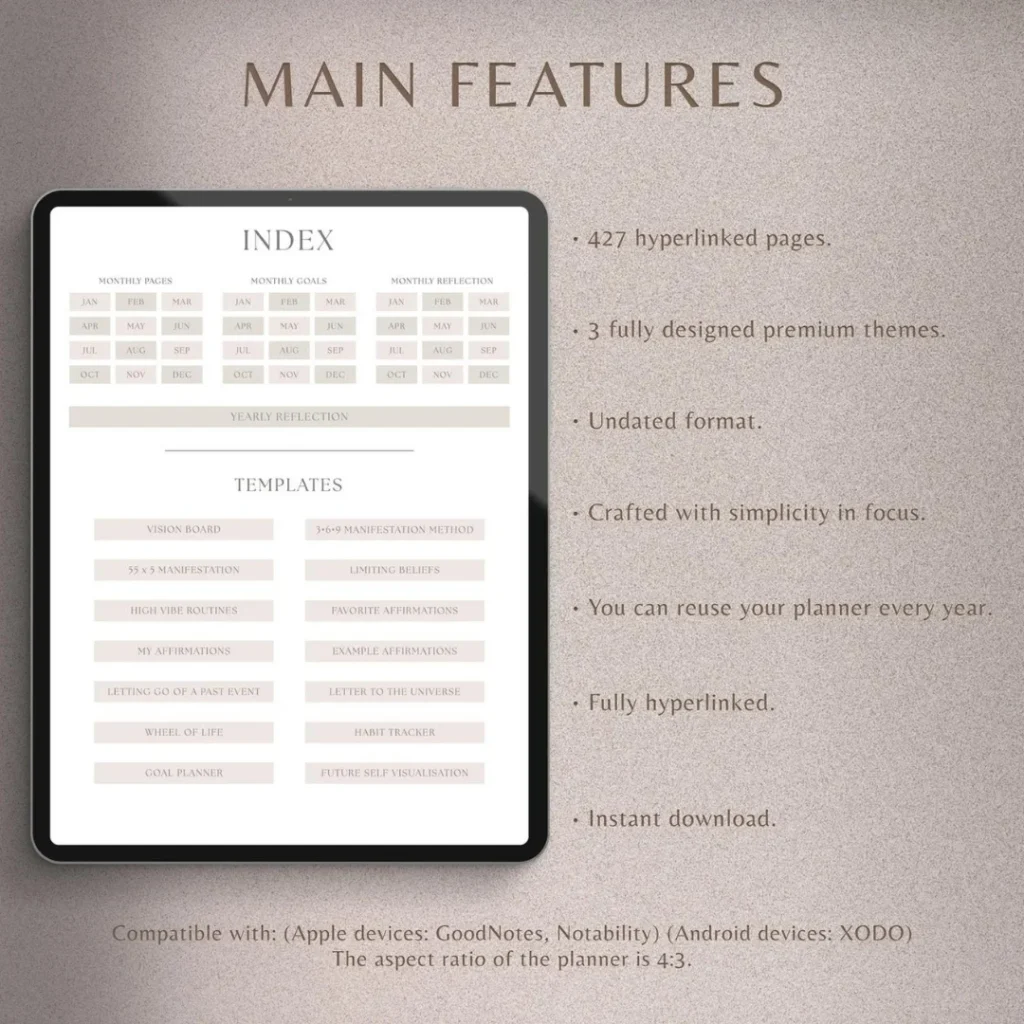 Please note that the planner has a 4:3 aspect ratio, like all iPads. If your tablet has a different aspect ratio, the planner may have different proportions and may not fill the entire screen.